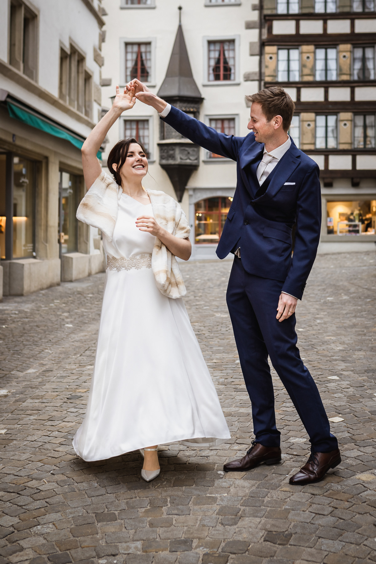 It was the beginning of February 2021. After many rainy days in Central Switzerland, the sun started to shyly break through the clouds. On Friday afternoon there were not many people on the streets of the old town of Zug. I immediately noticed Niels coming from the direction of Kolinplatz. He was a little stressed and happy at the same time. I took a few groom’s portraits near the Zug Townhall. Then the bride came. I’ve met Marissa before, during our family sessions. Every time she was smiling and cheerful. However, on her wedding day, she literally radiated joy. During their first look near the Zuger Clock Tower Zytturm, the sparkles of joy and love in Niels’ eyes confirmed how delighted he was.